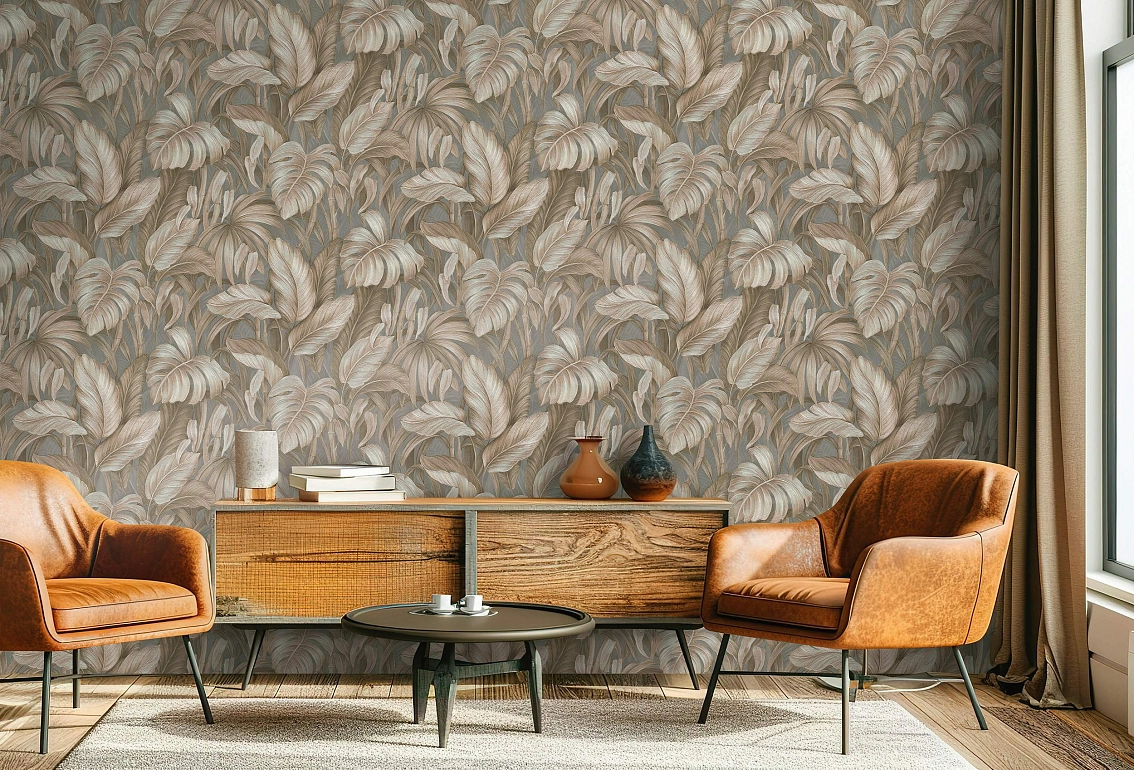 Флористический узор в коричневых тонах создаст уют и гармонию в любом помещении. Листья Voyage, являющиеся частью сэтов номенклатуры, придадут стенам особый шарм и оригинальность. Раппорт в 64 позволит легко расположить обои на стене, создавая эффектный декор.